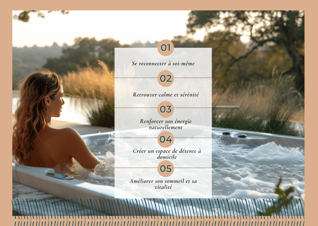 Réduction du stress : L’eau chaude et les jets massant libèrent les tensions musculaires et apaisent l’esprit. Un moment dans un spa, c’est comme une séance de méditation. Renforcement du système immunitaire : La balnéothérapie améliore la circulation sanguine et aide à renforcer les défenses naturelles. Un espace de reconnexion : En famille, entre amis ou en solo, le spa devient un lieu de partage et de détente, loin des écrans et des mauvaises nouvelles.